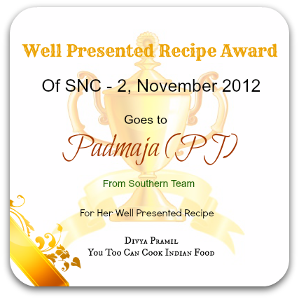 - Well Presented Recipe - Goes To PJ from Southern team & Shruti (Shruti's Rasoi). I loved all the presentation of all participants, each one had presented the recipe in a unique way and according to me everyone deserves this award. One well presented recipe from each team will be selected and awarded 15 points each. Preference will be given to the picture and presentation. Divya Prakash also had presented well, but since she had not linked her recipe the award goes to PJ.